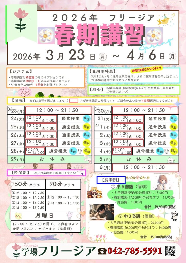 3月または4月に通常授業を受け、さらに春期講習を申し込まれた方は、春期講習が30%オフになります。