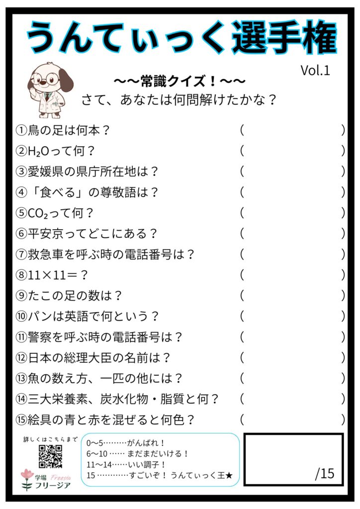 フリージアでは、日常的に使われる言葉や習ったことのある計算問題、見たことのあるモノの名前など、一般的な基礎知識をクイズ形式の問題にして配布したり、窓に掲示しています。